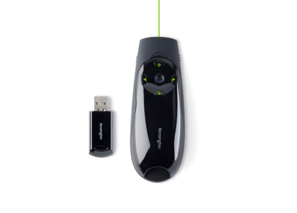 Nemůžete zdůraznit klíčové myšlenky, pokud to nikdo nevidí. Tento problém vyřešíte pomocí jasného zeleného laseru prezentačního zařízení Kensington Expert se zeleným laserovým ukazovátkem s ovládáním kurzoru, které je vhodné i pro ty největší místnosti a nejjasnější obrazovky Některé z dnešních jasných LCD a plazmových obrazovek představují pro červená laserová ukazovátka skutečnou výzvu. Ne však pro zelený laser prezentačního zařízení Kensington Expert se zeleným laserovým ukazovátkem. Tento laser Je 10krát jasnější než standardní červené lasery, takže obstojí i proti nejsvětlejším LCD a plazmovým displejům. Samozřejmě že bezdrátový ovladač prezentací je víc než jen svítivé ukazovátko. Intuitivní design prezentačního zařízení Expert se čtyřmi tlačítky umožňuje snadnou orientaci v prezentacích Keynote® nebo PowerPoint®. A když budete potřebovat přesunout kurzor, jednoduchým uchopením tlačítka získáte plné ovládání kurzoru. Výkonné dálkové ovládání s frekvencí 2,4 GHz odolává rušení a umožňuje ovládat aplikace Keynote nebo PowerPoint až na vzdálenost 50 metrů (150 stop). USB přijímač ukládá data uvnitř prezentačního zařízení, takže se nemusíte obávat jejich chybného umístění. Prezentační zařízení Kensington Expert má podsvícená tlačítka, a tak se nemusíte bát, že byste na dálkovém ovládání nenašli to správné tlačítko. Bezdrátový dosah až 50 metrů (150 stop) Zelené laserové ukazovátko je 10x jasnější než standardní červená ukazovátka. Indikátor slabé baterie Podsvícená tlačítka Dva režimy – okamžitý přechod z režimu prezentace do režimu ovládání kurzoru Vypínač Ukládání na vnitřní USB přijímač Pouzdro je součástí balení Ovládání prezentací Keynote a PowerPoint |