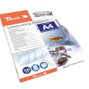 Peach Laminovací fólie A4, 100mic, lesklé, 100ks 100 ks lesklých laminovacích fólií (kapes) o tloušťce 100 µm, určených pro laminování dokumentů velikosti A4. |
