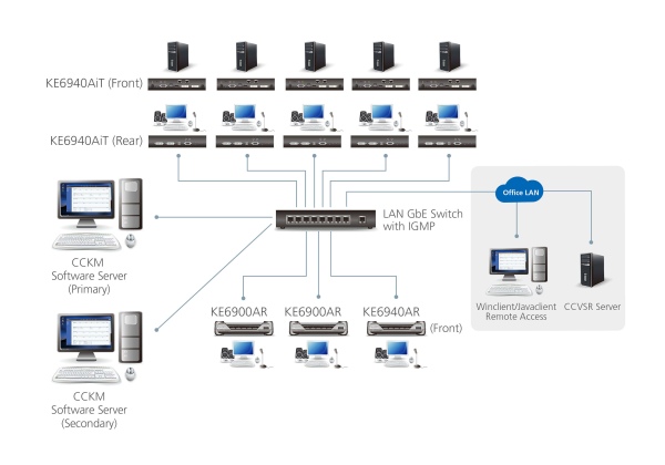 KE6900AiT jsou vysoce výkonné vysílače založené na protokolu IP, které při použití s přijímači (např. KE6900AR) umožňují přístup ke konzole ze samostatného místa. Tato konfigurace umožňuje rozšířený vzdálený přístup k počítačovým systémům prostřednictvím konzolí USB (klávesnice USB, myš USB, monitor DVI) přes intranet a internet, což uživatelům umožňuje umístit počítačový systém do bezpečného a teplotně řízeného prostředí, které může být izolováno od pracovní stanice uživatele.