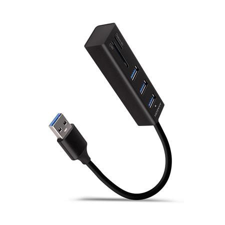 Kovový USB 3.2 Gen 1 (USB 3.0) multi-port hub AXAGON HMA-CR3A nejen připojí k notebooku nebo počítači až tři USB zařízení současně, ale přidá také čtečku paměťových karet SD / microSD.