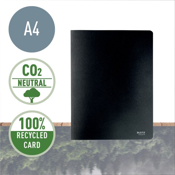 Vyrobeno ze 100% recyklovaného (PCR) kartonu, 100% recyklovatelné (po vyjmutí kovového vazače), CO2 neutrální, ekologická certifikace Blue Angel