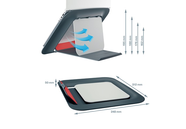 Stojan pod notebook Leitz Cosy Ergo zvedne monitor vašeho notebooku, zvýší tak pohodlí jeho sledování a pomůže zlepšit držení těla. Stojan zvedne notebook a usnadní cirkulaci vzduchu pro chlazení notebooku, přispívá se zvýšení výkonnosti akumulátoru a dalších komponent. Díky minimalistickému designu a matným barvám zlepší pohodu a dodá styl uspořádání vašeho pracovního místa.