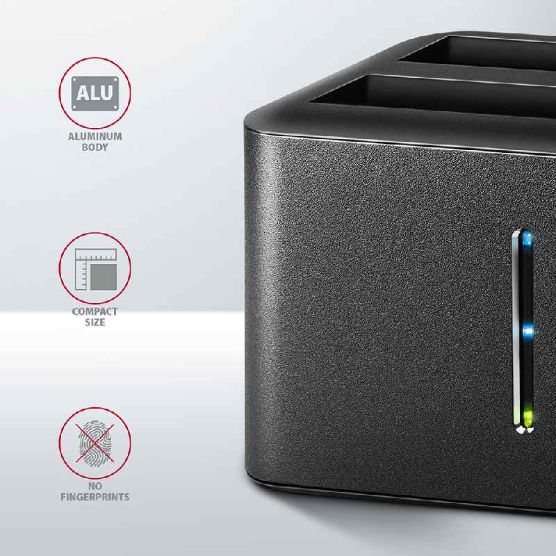 Tento kompaktní pomocník vám tak umožní nejjednodušší připojení libovolných 2.5" SATA disků k počítači nebo notebooku. Jeden nebo i dva disky současně jen stačí zasunout do základny, nejsou potřeba žádné nástroje ani doplňky. Výměna disků je tak velmi rychlá a jednoduchá. Dokovací stanici také využijete pro snadné klonování obsahu připojených disků bez potřeby připojení k PC. Do prvního slotu stanice HDD A (source) zasunete zdrojový disk a do druhého slotu HDD B (target) zasunete cílový. Pak jen zmáčknete klonovací tlačítko a sledujete průběh klonování na stupnici čtyř LED diod. Po zkopírování všech dat je na cílovém disku přesná kopie původního disku. Dock tak lze využít jako autonomní zařízení pro pohodlné duplikování a vytváření obrazů disků. Jedná se o nejjednodušší způsob, jak přenést obsah například starého HDD disku na nový SSD disk, a to včetně funkčního operačního systému (Windows, macOS, Linux …). Rozhraní SATA 6G s podporou UASP dovolí užívat si rychlost moderních SSD disků. Podpora funkce TRIM pro omezení pozvolné degradace výkonu SSD v čase. Stanice umožňuje čtení S.M.A.R.T. informací monitorujících kondici SSD / HDD. Podporuje usínání připojených disků i stanice. Skříň stanice je dostatečně robustní a odolná, což umožňuje dokonalou stabilitu i s vloženými disky. Gumové nožky omezují posouvání po stole a vibrace pevných disků. Vnější plášť je proveden z hliníku s elegantním broušeným povrchem. Vstup: • USB 3.2 Gen 1 (USB 3.1 Gen 1 / USB 3.0) SuperSpeed USB 5 Gbps. • Rychlost až 5 Gbit/s. • Připojení přes USB Micro-B female konektor. Podpora zařízení: • Rozhraní SATA III - 6 Gb/s (600 MB/s). • Podpora 2.5" SSD/HDD. • Max. kapacita disku - všechny bez omezení. • Max. výška 2.5" disku - všechny bez omezení. Vlastnosti: • Kompatibilní s USB 3.2 Gen 2 (USB 3.1 Gen 2), USB 3.2 Gen 1 (USB 3.1 Gen 1 / USB 3.0), zpětně kompatibilní s USB 2.0. • Podpora přenosových rychlostí 5000 / 480 Mbit/s (SuperSpeed / HighSpeed). • Vyhovuje Serial ATA 3.0 specifikaci (SATA/600), přenosové rychlosti až 6 Gb/s (600 MB/s). • Vyhovuje Serial ATA 2.0 specifikaci (SATA/300), přenosové rychlosti až 3 Gb/s (300 MB/s). • Vyhovuje Serial ATA 1.0 specifikaci (SATA/150), přenosové rychlosti až 1.5 Gb/s (150 MB/s). • Vyhovuje USB Mass Storage Class specifikaci. • Celková propustnost / přenosová rychlost stanice je dána použitým USB rozhraním (teor. 5 Gbit/s). • BOT (Bulk-Only Transport). • Podpora UASP (USB Attached SCSI Protocol) pro rychlejší přenos dat ve Windows 8 a novějších. • Podpora funkce TRIM pro omezení pozvolné degradace výkonu SSD v čase. • Podpora S.M.A.R.T. (Self-Monitoring, Analysis, and Reporting Technology) systém monitorující stav disku. • Podpora bootování z SSD/HDD v dokovací stanici. • Možnost připojení zařízení za chodu díky podpoře Hot Plug. • Plná podpora Plug and Play. • HDD Auto Spin down - vypínání disků při nečinnosti. • HDD Turn Off - vypnutí disku po odebrání zařízení nebo uspání PC. • Připojení přes USB 3.2 Gen 1 Micro-B female konektor. • Kabel USB Micro-B --- USB-A délky 60 cm je součástí balení. • LED indikující napájení SSD/HDD docku a aktivitu disků v obou šachtách. • Rozměry stanice 89 x 58 x 59 mm. • Hmotnost 137 g. Napájení: • Napájecí kabel USB-A --- 3.5/1.3 mm DC 5V délky 1 m je součástí balení. Kabel umožní napájení stanice z USB-A portu počítače nebo běžné nabíječky mobilních telefonů s USB-A výstupem 5V / min. 1A, např. AXAGON ACU-DS16. • Vypínač napájení. Funkce klonování obsahu disku: • Klonování probíhá bez připojení stanice k počítači. • Cílový disk musí mít stejnou nebo větší kapacitu jako disk zdrojový, jinak nelze klonování spustit. • Klonovat lze jak pevné disky HDD, tak SSD. • Rychlost klonování SSD až 300 MB/s. • Celkový čas naklonování disku závisí na kapacitě zdrojového disku, ne na objemu dat na disku. Podporované operační systémy: • MS Windows 7 / 8 / 10 / 11 a novější, Windows Server 2008 / 2012 / 2016 / 2019 / 2022 a novější (podporovány všechny 32- i 64-bitové verze OS Windows), Mac OS X 10.x a vyšší, Linux s jádrem 2.6.x a vyšším. • Pozn.: Ovladače jsou součástí podporovaných operačních systémů a nainstalují se zcela automaticky. Žádné jiné ovladače není třeba instalovat a nejsou ani k dispozici. Balení obsahuje: • SSD/HDD dock, • USB Micro-B --- USB-A kabel délky 60 cm, • napájecí kabel 100 cm, • multijazyčný manuál CZ / DE / DK / ENG / ESP / FIN / FR / GR / HR / HU / IT / NL / PL / PT / RO / RU / SK / SWE / TR / BG / CN / ARA, • baleno v kartonové krabičce. Technické specifikace Vstup rozhraní: USB 3.2 Gen 1 / USB 3.1 Gen 1 / USB 3.0 / USB 2.0 rychlost: 5.000 / 480 Mbit/s (super+ / super / high speed) konektor: USB type A samec (na kabelu do PC) konektor: USB 3.0 micro B samice (na docku) kabel: 100 cm Výstup rozhraní: Serial ATA 3.0 konektor: 2x 22-pin SATA datový a napájecí samice kompatibilita: všechny SATA I / SATA II / SATA III disky celková propustnost: 5 Gbit/s teor. (dána USB 3.0 vstupem) Podporované zařízení 2.5": ano max. kapacita disku: všechny, bez omezení Podporované vlastnosti klonování disků: ano UASP: ano TRIM: ano S.M.A.R.T.: ano boot z připojeného disku: ano automatická instalace: ano Plug and Play: ano Hot Plug: ano Další vlastnosti provedení: kov bezšroubková montáž: ano indikace: LED ovládací prvky: tlačítko CLONE - spouští klonování disků rozměry: 89 x 58 x 59 mm hmotnost: 137 g Napájení po sběrnici: ne Podpora OS MS Windows: 11 / 10 / 8.1 / 8 / 7 MS Windows Server: 2022 / 2019 / 2016 / 2012 / 2008 Mac OS: X 10.x a vyšší Linux: 2.6.x jádro a vyš