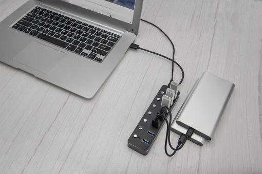Rozbočovač USB 3.0, 7 portů, přepínač Hliníkové pouzdro, včetně zdroje 5V/2A