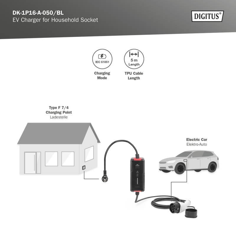 Nabíječka EV, 5m, 230 V, Typ F 7/4 až EV Typ 2, Nastavitelný nabíjecí výkon:1,8; 2,3; 2,8; 3,7 kW