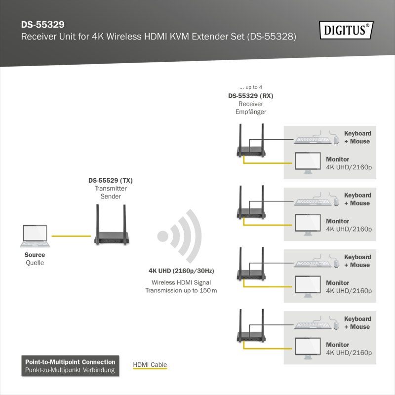 Rozšiřte sadu 4K Wireless HDMI® KVM Extender Set (DS-55328) až o 4 přijímače (výstupní zařízení) Point-to-multipoint připojení - 1x vysílač (zdroj) + až 4x přijímače (výstupní zařízení) Zpětné ovládání dotykové obrazovky - Podporuje dotykové panely (přes USB připojení na přijímači) Bezdrátový kanál: IEEE 802.11.b/g/n/ac Frekvenční pásmo: Dual Band, 2,4/5G Komprese: H.265 Latence: cca. 100 ms 128bitové šifrování AES Autentizační protokol: WPA2 (WPAS-PSK / WPA2-Enterprise) Verze HDMI: 2.0 POPIS Pomocí této přídavné přijímací jednotky můžete rozšířit 4K Wireless HDMI® KVM Extender Set (DS-55328) až o 4 přijímače (výstupní zařízení). Distribuujte své AV signály bezdrátově až na 4 obrazovkách. TECHNICKÉ ÚDAJE Point-to-multipoint připojení - 1x vysílač (zdroj) + až 4x přijímače (výstupní zařízení) Zpětné ovládání dotykové obrazovky - Podporuje dotykové panely (přes USB připojení na přijímači) Bezdrátový kanál: IEEE 802.11.b/g/n/ac Frekvenční pásmo: Dual Band, 2,4/5G Komprese: H.265 Latence: cca. 100 ms 128bitové šifrování AES Autentizační protokol: WPA2 (WPAS-PSK / WPA2-Enterprise) Verze HDMI: 2.0 Připojení jednotky přijímače: 1x HDMI výstup (výstupní zařízení, 4K/60Hz max.) 2x USB-A vstup (připojení myši/klávesnice/dotykového panelu) 1x USB-C vstup - připojení napájecího adaptéru (5V/2A) 1x tlačítko Reset 1x vypínač Pouzdro: kov Černá barva Rozměry: š 15,4 x h 7,75 x v 2,1 cm Hmotnost: 330 g Spotřeba energie (1 jednotka): cca. 5W Provozní teplota: 0-40 °C Upozornění výrobce: Přenosovou vzdálenost s omezeným viditelným dosahem nelze obecně určit a závisí na konkrétních okolnostech v místě instalace Stěny, sklo atd. zkracují dosah signálu nebo způsobují ztráty signálu KVM: ne PoE (Power over Ethernet): ne OBSAH BALENÍ 1x Přijímací jednotka 1x USB napájecí adaptér (5V/2A) 1x kabel USB-A na USB-C (1,5 m) 1x propojovací kabel HDMI (1,5 m) 1x QIG |