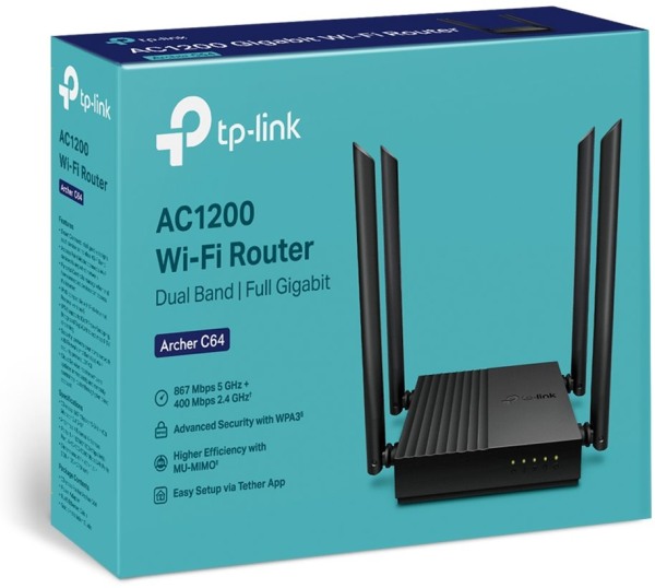 Archer C64 je velmi kompaktní Dual-Band router značky TP-Link, který obsahuje 4x 10/100/1000Mbps LAN, 1x 10/100/1000Mbps WAN a 4 fixní antény. Bezdrátová část umí pracovat ve dvou pásmech zároveň a to rychlostí 400Mbps ve 2.4GHz pásmu a 866Mbps v pásmu 5GHz. Router podporuje IPv4 i nejnovější IPv6 routování. Router kromě nejvíce používaného modu AP Router podporuje i režim Access point.