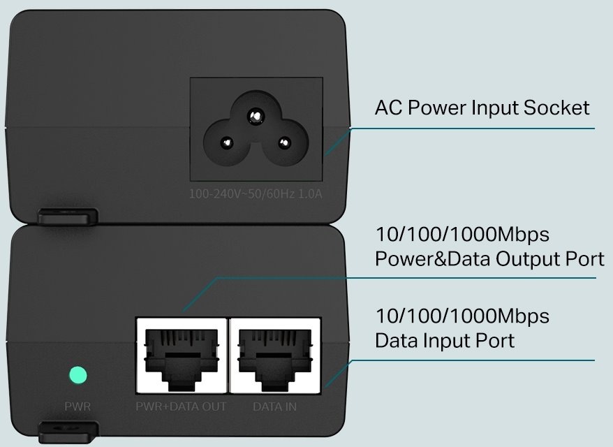 TL-POE160S je velmi robustní Gigabitový napájecí PoE+ injektor, který podporuje 802.3af/at standardy s výkonem až 30W, což je vhodné řešení pro napájení většiny IP kamer s podporou PoE, VoIP, WiFi AP a dalších zařízení. Injektor má LED indikaci, 3-pinový napájecí konektor na 230V a dva RJ-45 porty z nichž první je určen na DATA a druhý na DATA + napájení.
