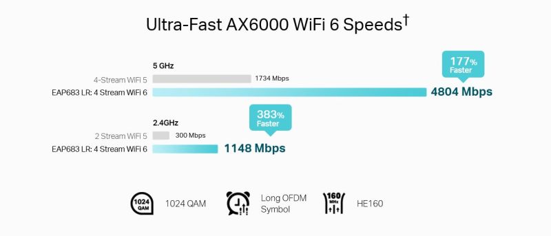 Až 5952 Mb/s WiFi 6 rychlosti: 1148 Mb/s na 2,4 GHz + 4804 Mb/s na 5 GHz†
