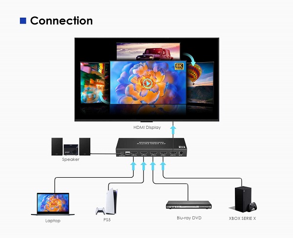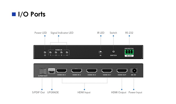 4 HDMI zařízení sdílí 1 HDMI výstupní zařízení (obrazovku). Výběr zařízení tlačítkem nebo dálkovým ovládáním. - HDMI rolišení 8K@24/25/30/50/60Hz, 4K@24/25/30/60/100/120Hz, 1080p/1080i - Podporuje datový tok 48Gbps a frekvenci až 1200MHz - Rozlišení: 7680x4320@24/25/30/50/60Hz, 4096x2160@24/25/30/50/60/100/120Hz, 3840x2160@24/25/30/50/60/100/120Hz, 3440x1600@60Hz, 3440x1440@60Hz, 2560x1600@60Hz, 2560x1440@60/100/120Hz, 2560x1080@60Hz, 2048x1080@60Hz, 1920x1440@60/100/120Hz, 1080p@50/60/100/120Hz, 1080i@50/60Hz, 720p@50/60Hz - Podporuje standard HDMI2.1 - Podporuje standard HDCP2.3 a nižší - Podporuje (High Dynamic Range Imaging) HDR10+, HDR10, Dolby Vision - Vstupní konektory: 4 x HDMI - Výstupní konektor: 1 x HDMI - Zvukový výstup S/PDIF podporuje: Dolby Atmos, Dolby True HD,DTS:X,DTS-HD - HDMI zvukový výstup podporuje: Dolby Atmos,Dolby Digital 7.1CH,Dolby True HD,DTS:X DTS-HD,LPCM 7.1CH - Výběr vstupu tlačítkem nebo dálkovým ovládáním, pomocí RS232 - Plug-and-play, není třeba software. - V sadě dálkové ovládání pro komfortní obsluhu - Podpora 3D obrazu - Přídavný adaptér 230V/5V, 1A v sadě - Spotřeba max. 2W - Pracovní teplota: -20 až 60 °C - Relativní vlhkost: 0-90% - Rozměry: 160mm x 58mm x 20,6mm - Váha: 275g - Pouzdro kovové - Barva: černá |