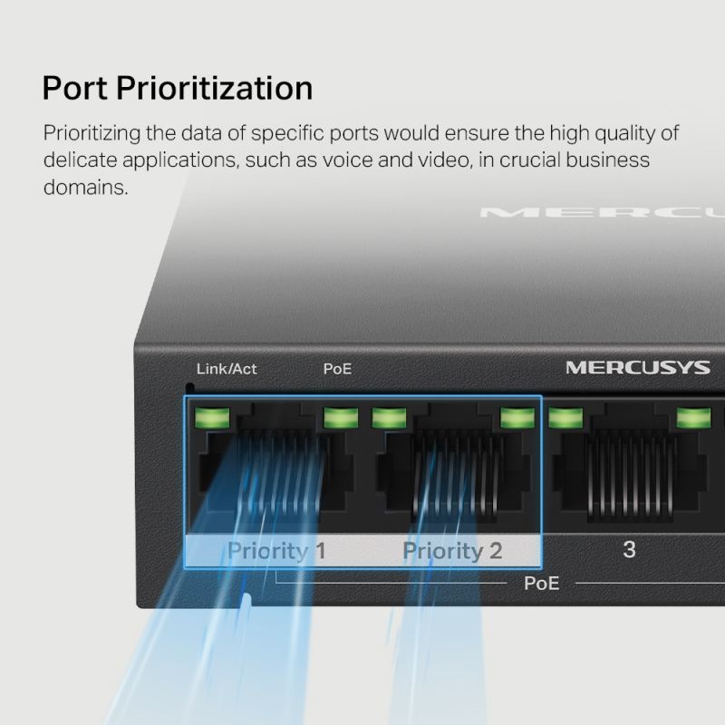 MS105GP je 5portový plně Gigabitový POE switch v desktop provedení. Switch podporuje standardy 802.3af/at s maximálním výkonem 30W/port a disponuje celkovým POE budgetem 65W na 4 portech. Prioritizace prvních dvou portů zajistí bezchybné fungování napájených zařízení náchylných na bezchybný přenos dat, například hlasu nebo videa. Díky mechanickému přepínači na zadní straně lze přepnout do Extend módu. kdy se maximální dosah prodlouží až na 250m, v závislosti na kvalitě kabelu a příkonu napájeného zařízení. Linková rychlost je v tomto módu automaticky snížena na 10Mbps. Samozřejmostí je možnost izolace jednotlivých POE portů Kovové šasi zajišťuje optimální chlazení a dlouhou životnost switche.
