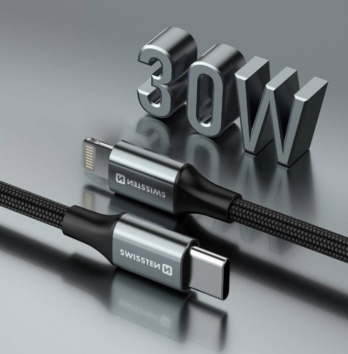 SWISSTEN DATOVÝ KABEL TEXTILE II USB-C / LIGHTNING 1,5 M ČERNÝ