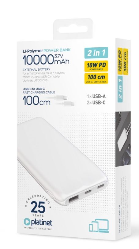 Je vybavena nejpoužívanejšími výstupními porty, včetně jednoho standardního portu USB-A a dvou portů Type-C, z nichž jeden slouží k nabíjení samotné powerbanky. Port USB-A nabízí výstup 5V/2,1A, zatímco port typu C nabízí výstup 5V/2,1A, což vám umožní rychle a efektivně napájet vaše zařízení. Powerbanka je také kompatibilní s technologií rychlého nabíjení 10W PD (Power Delivery)! Vestavěný indikátor vám umožní snadno sledovat stav baterie powerbanky. Přiložený 100 cm kabel Typ-C nabízí pohodlné řešení nabíjení. Díky svým kompaktním rozměrům a rozumné hmotnosti se PMPB1010B snadno přenáší v tašce nebo kapse, což vám umožní mít záložní zdroj energie vždy po ruce. Technická specifikace Kapacita: 10000mAh při 3,7V / 7400mAh při 5V Výstup USB-A: 5V/2,1A Výstup typu C: 5V/2,1A Celkový výkon: 10W PD Rozměry: 137,3 x 68,35 x 15,85 mm Hmotnost: 221 g Konektor typu C 100 cm kabel typu C je součástí dodávky Digitální indikátor 1 port USB-A 2 porty typu C" |
