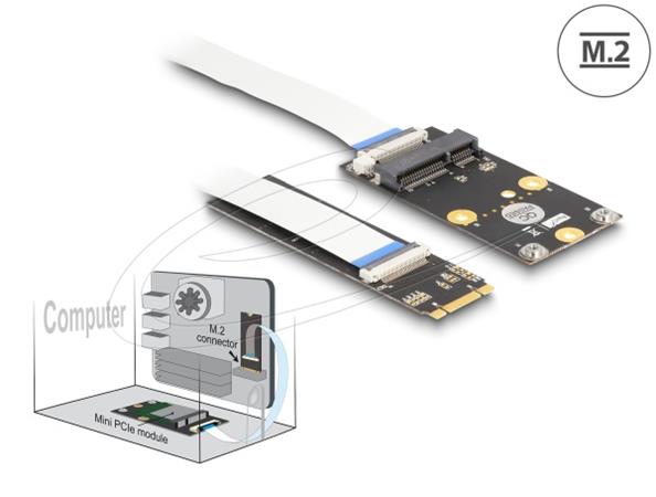 Tento převodník od Delocku mění rozhraní M.2 key B nebo key M na rozhraní Mini PCIe. Do převodníku mohou být vloženy různé Mini PCIe moduly. Na rozhraní M.2 key B nebo key M můžete použít např. tyto moduly: WLAN, Bluetooth, GNSS, 4G, 5G, HSPA a NFC. Dále je možné použít obě funkce modulu, který má např. WLAN a Bluetooth.