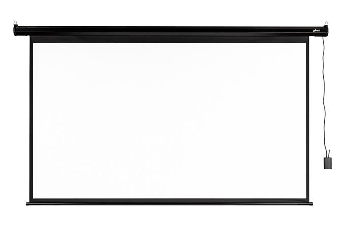 Projekční plátno roletové, rozměr 265 cm × 149 cm, úhlopříčka 120", poměr stran 16:9, matně bílé plátno, černé okraje, černé tělo, k umístění na strop a na zeď, motor pro navíjení, s dálkovým ovládáním