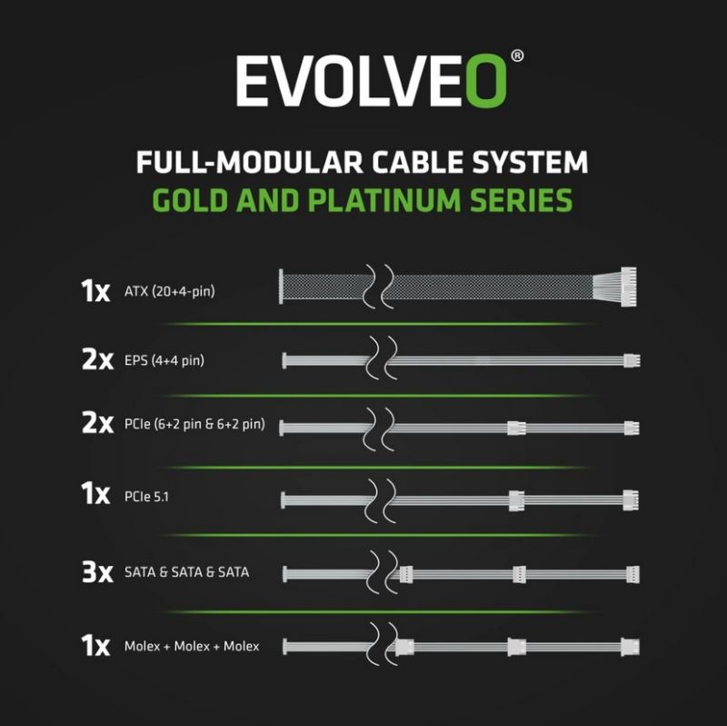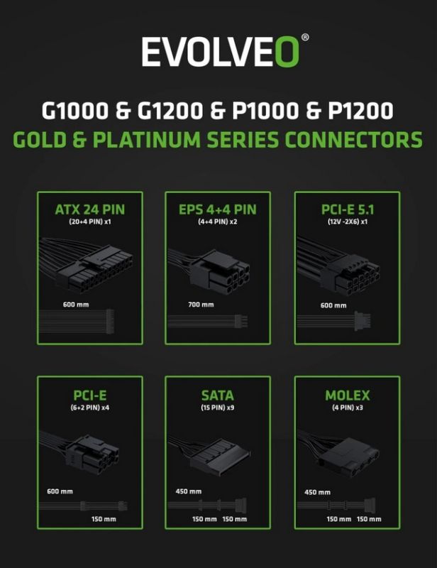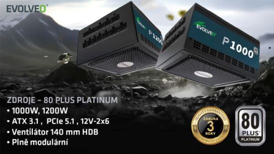 EVOLVEO P1000 zdroj 1000W, 80+ PLATINUM, ATX 3.1, aPFC, 140 mm ventilátor, 3 roky záruka, černý